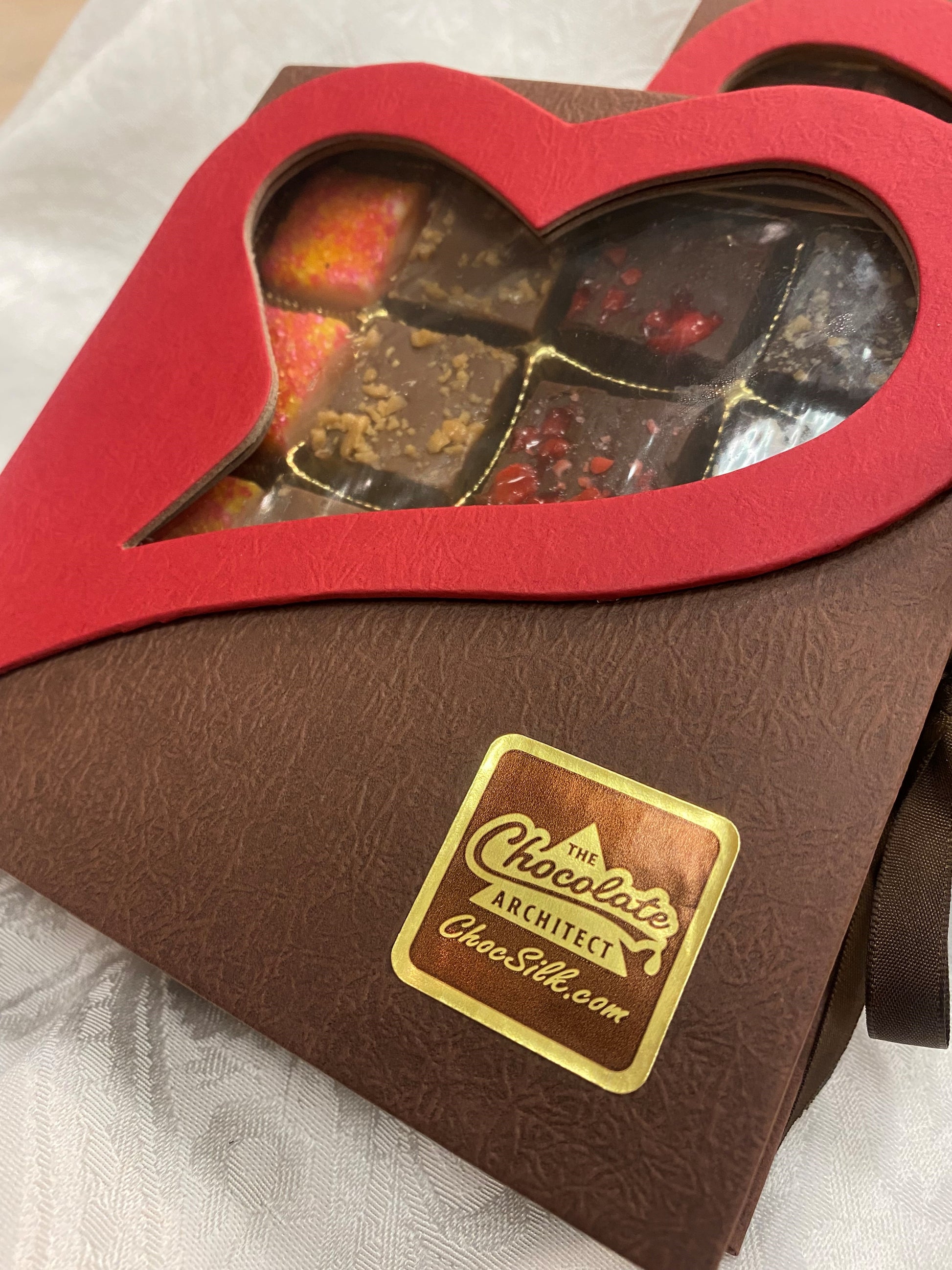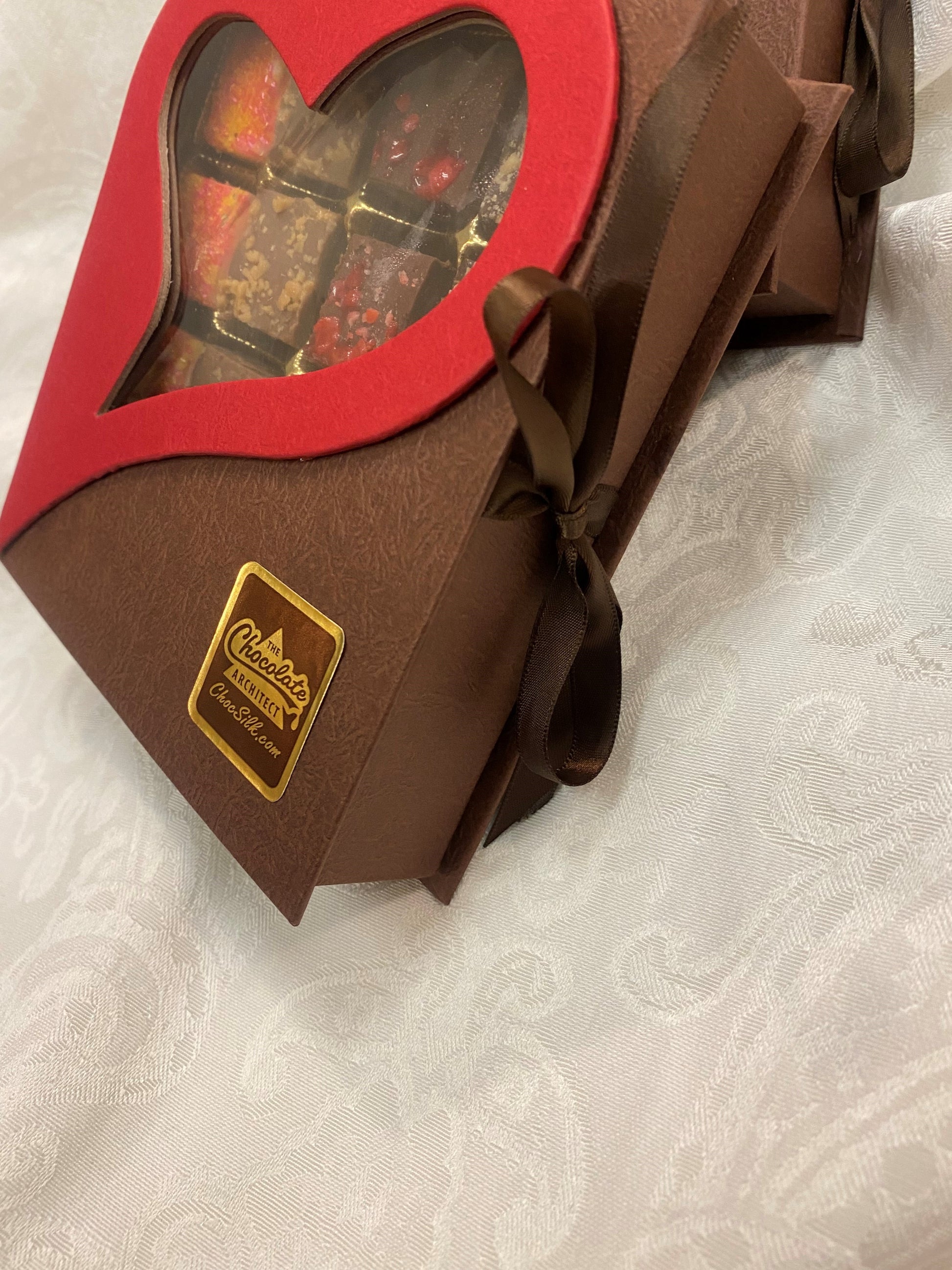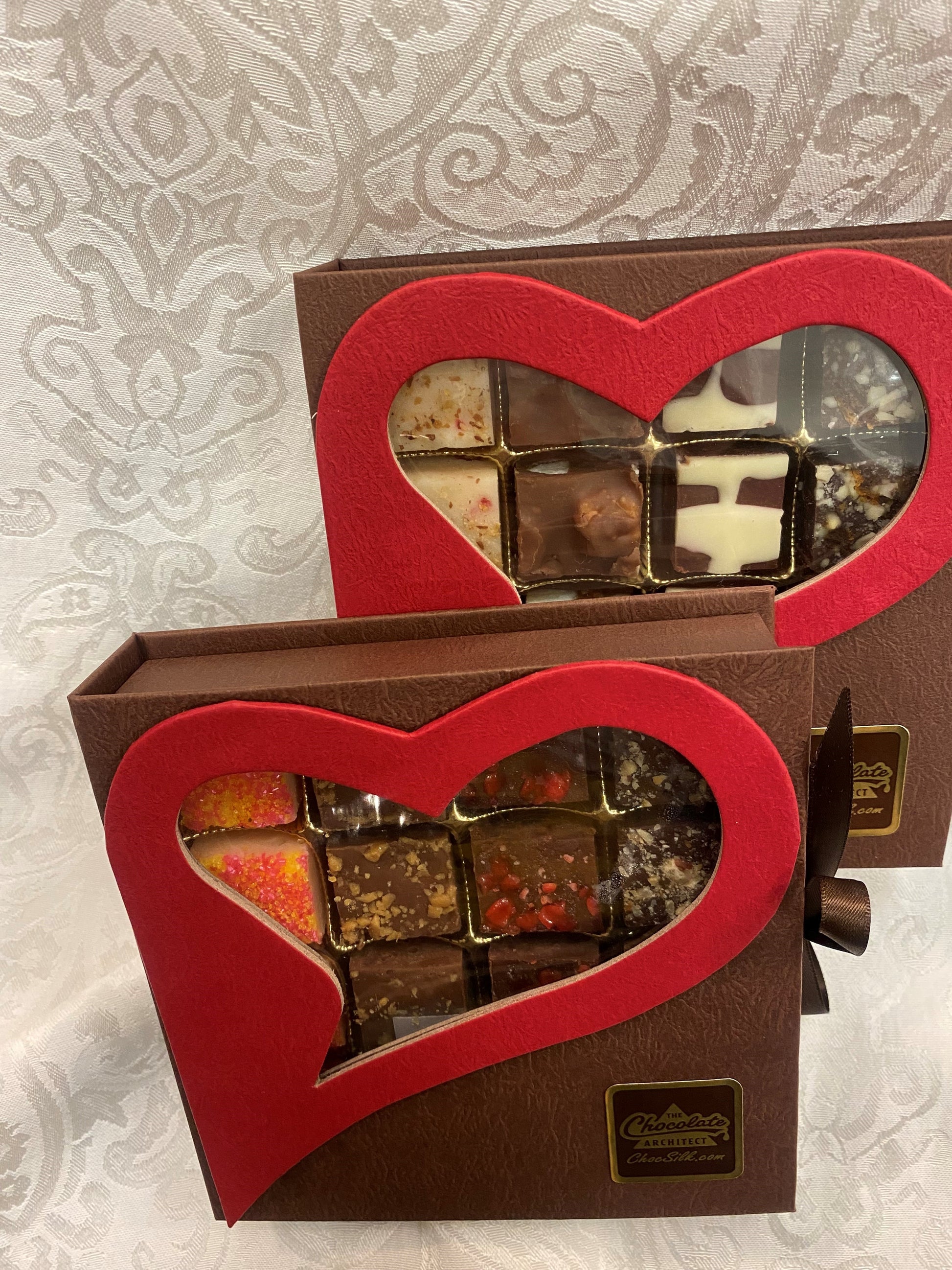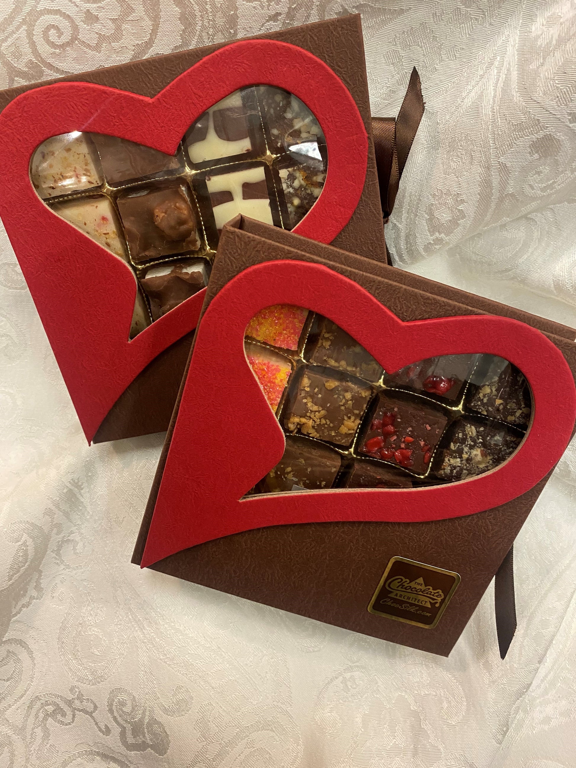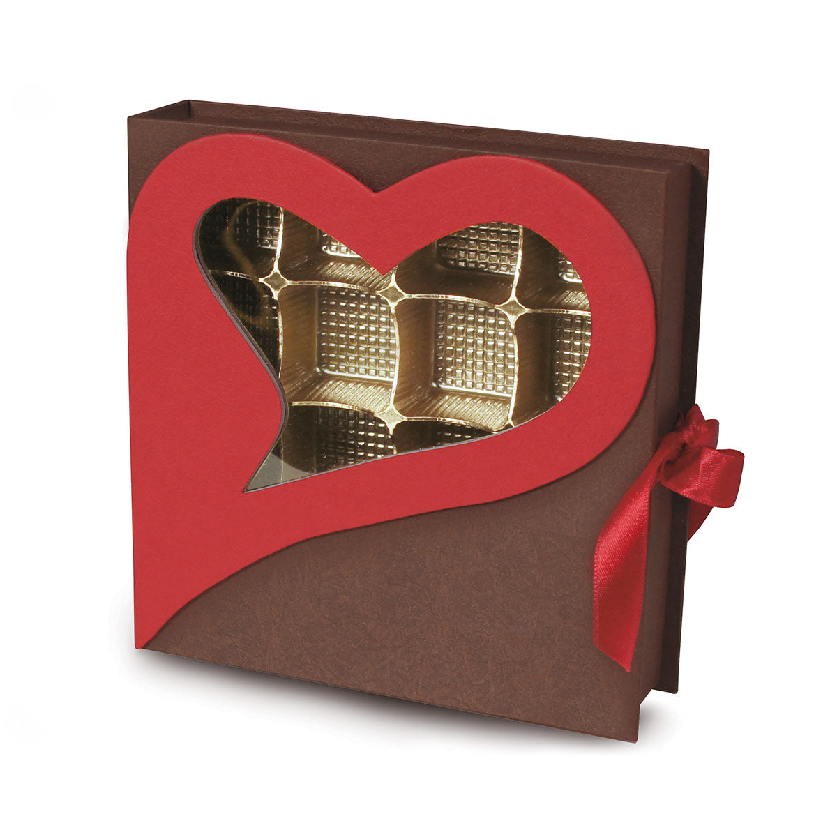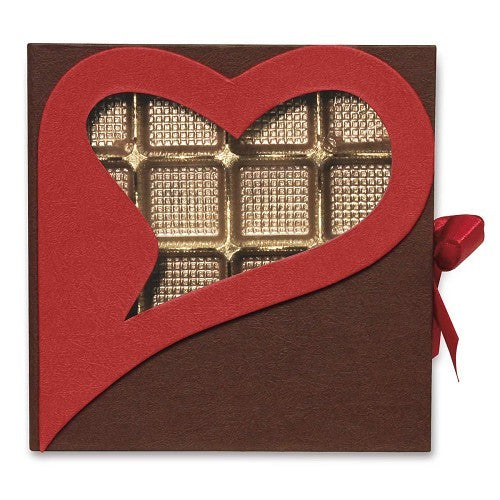 Charm your valentine with a Chocolate Silk Assortment of 1" blocks nestled in a gold tray that sits in a soft coco colored box with a clear red heart-shaped window. The red satin tie adds a feminine touch -a delicious way to make your Valentine's Day or weekend extra special. Choose form dark, milk, or an assortment of Chocolate Silk. Complimentary gold gift card for your sweet message.