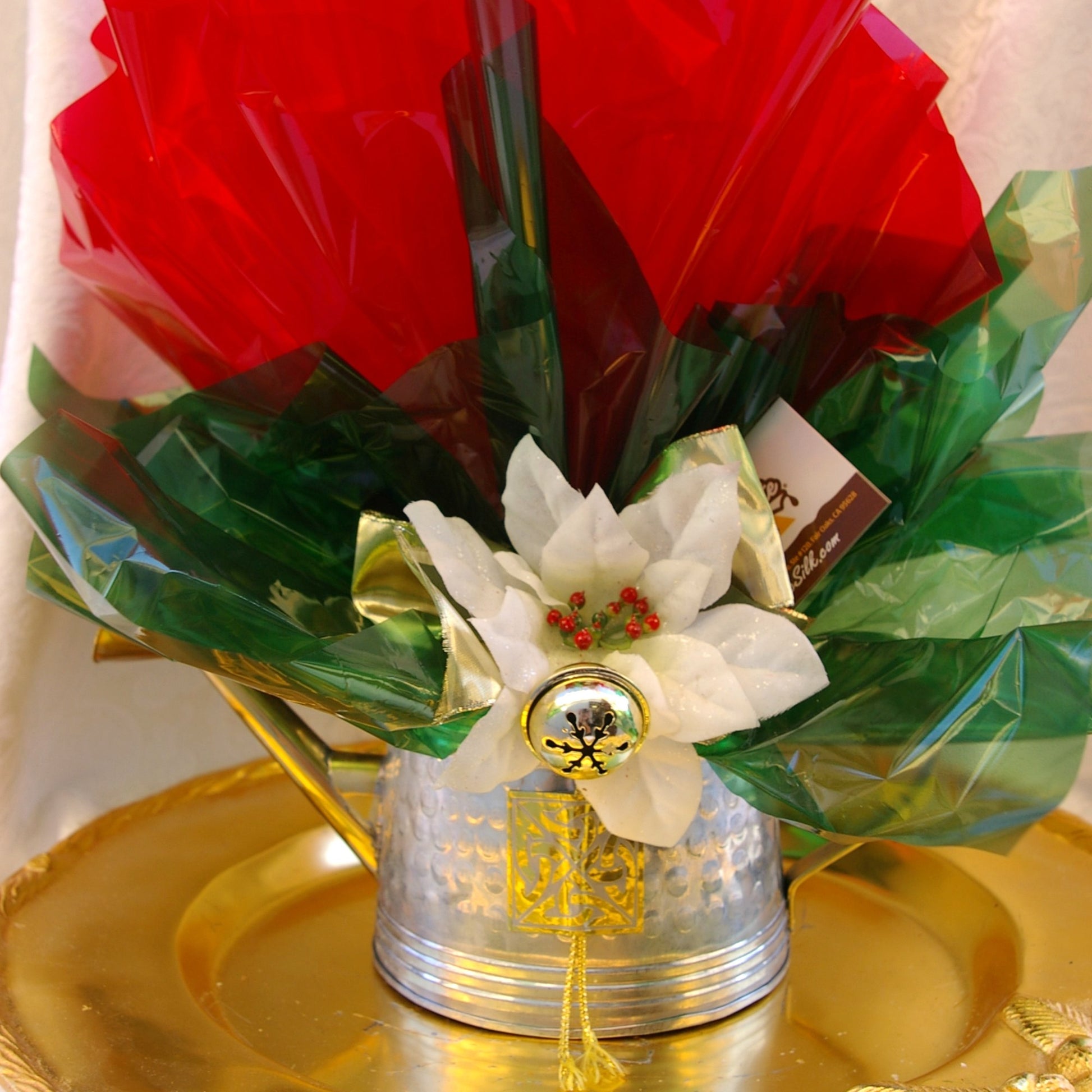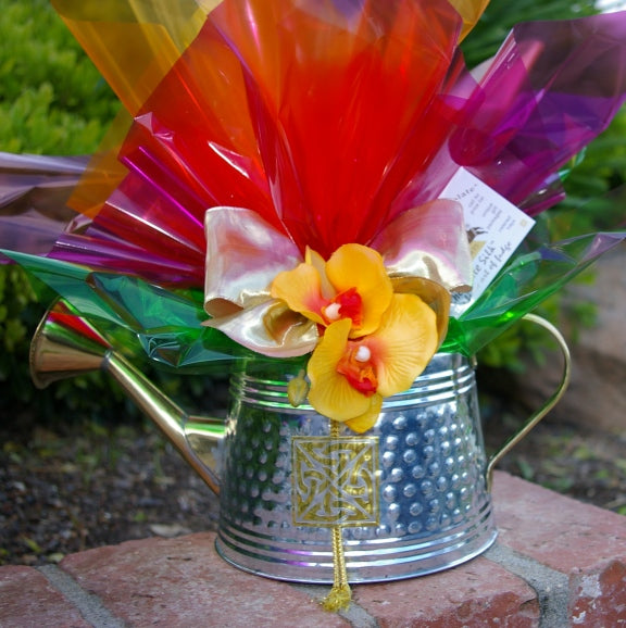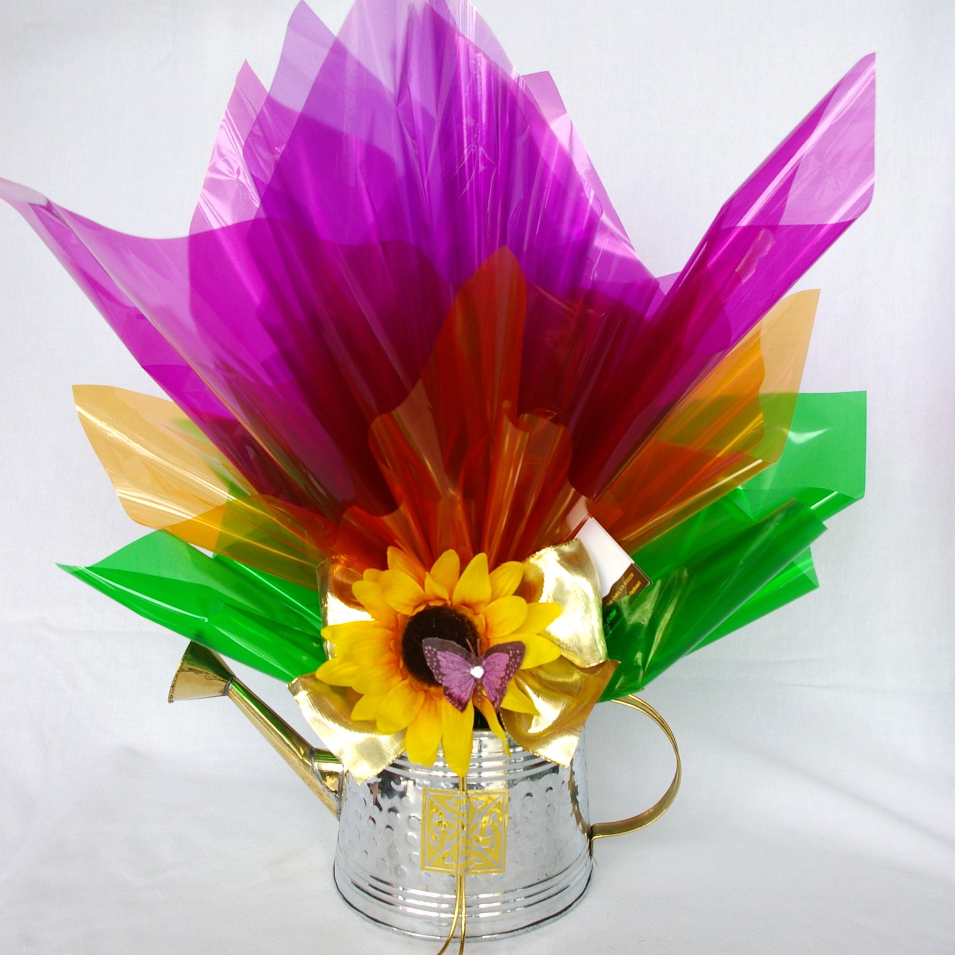A gorgeous way to that special someone's heart! Our Silk Bouquet is the perfect gift for your avid gardener—also stunning for a house-warming, Realtor, or birthday gift! The hammered-style watering can with brass spout and handle is filled to the brim with a stack of their favorite Chocolate Silk flavor(s), lovingly wrapped in a large cellophane bloom—your choice of colors with gold bow and seasonal silk flower detail. A favorite of moms everywhere. Consider as a centerpiece for sharing for dessert at a luncheon!