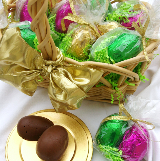 The quintessential Easter item. Fill a basket with our Double Foil-wrapped solid Chocolate Silk seasonal variety eggs nestled in a pinch of Easter grass & tied with gold ribbon. Hunt until you find every one!