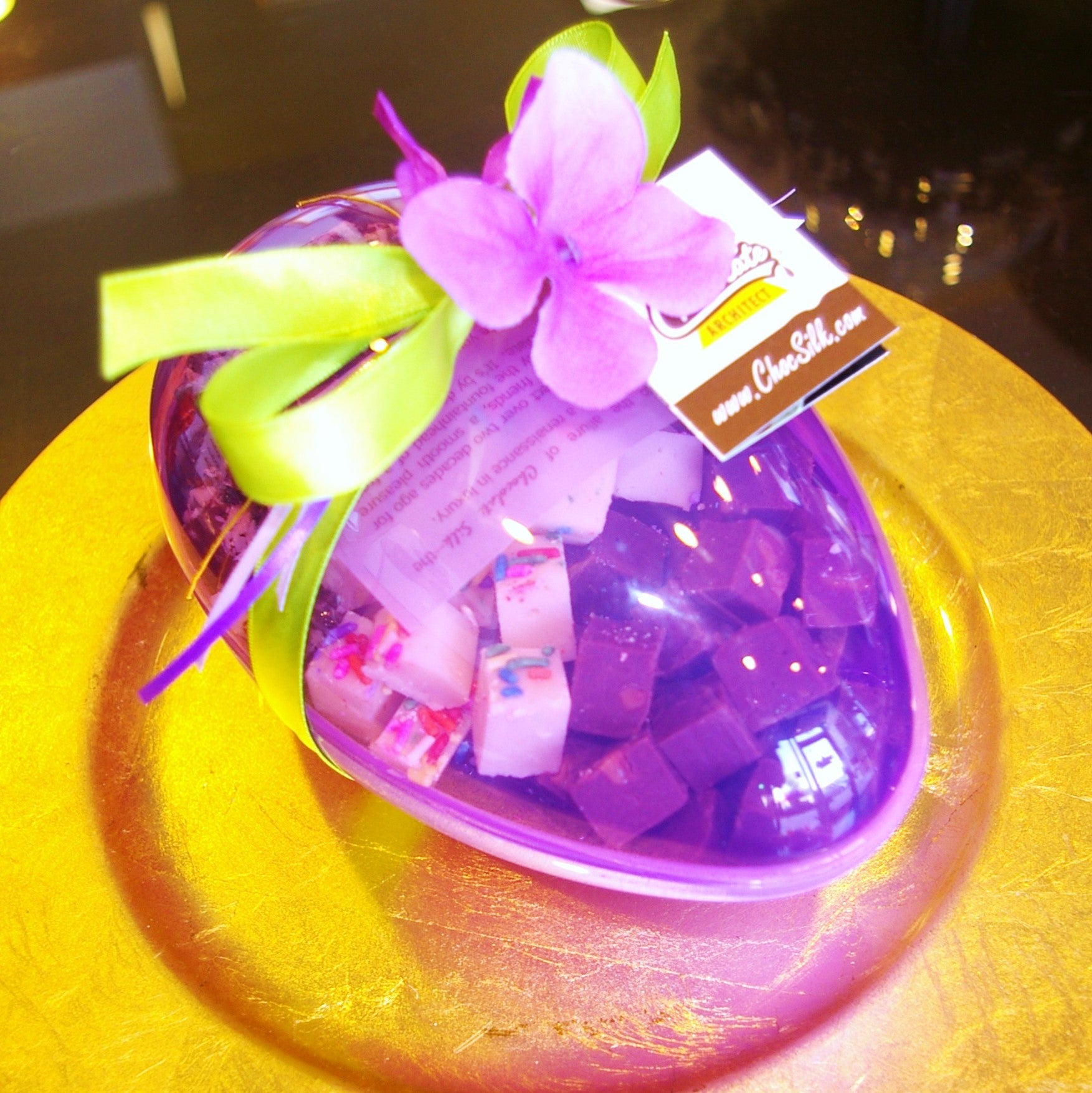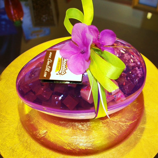 Hard shelled plastic colossal sized egg with tinted top shell to reveal 3 selections of your choice of Chocolate Silk Bites. Perfect for sharing with the family for Easter or Spring gatherings.